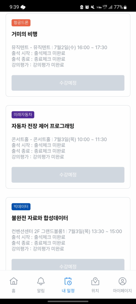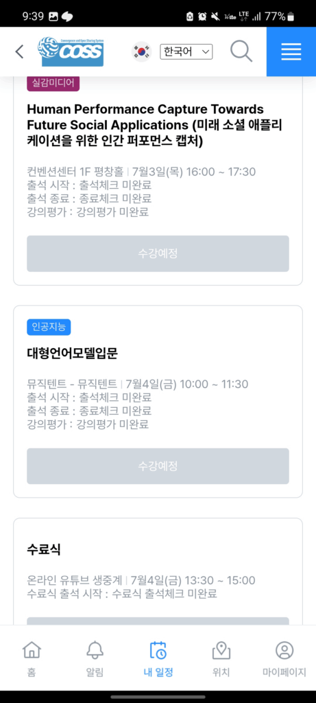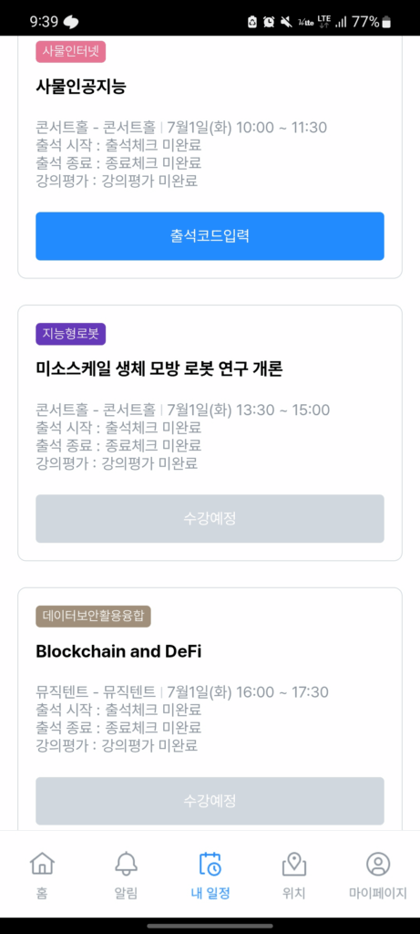 전용 앱으로 출석 시작, 종료 코드를 입력하면 수강이 되는 형태예요. (출튀하기 최적화 된 읍읍)