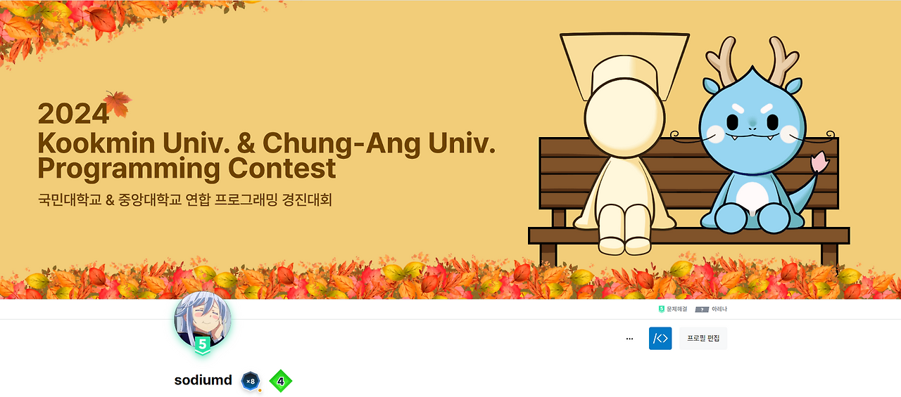 뭐 평범한 지망생이라 잘 하지는 못 해요. 2학기 들어서 2024 icpc와 교내에서 열린 국민대&중앙대 contest에 나갔어요.