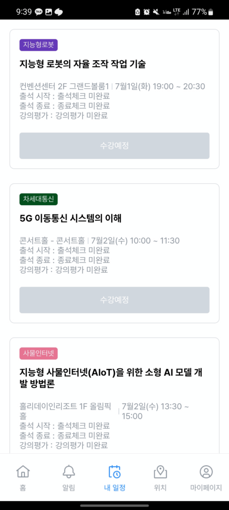 전용 앱으로 출석 시작, 종료 코드를 입력하면 수강이 되는 형태예요. (출튀하기 최적화 된 읍읍)