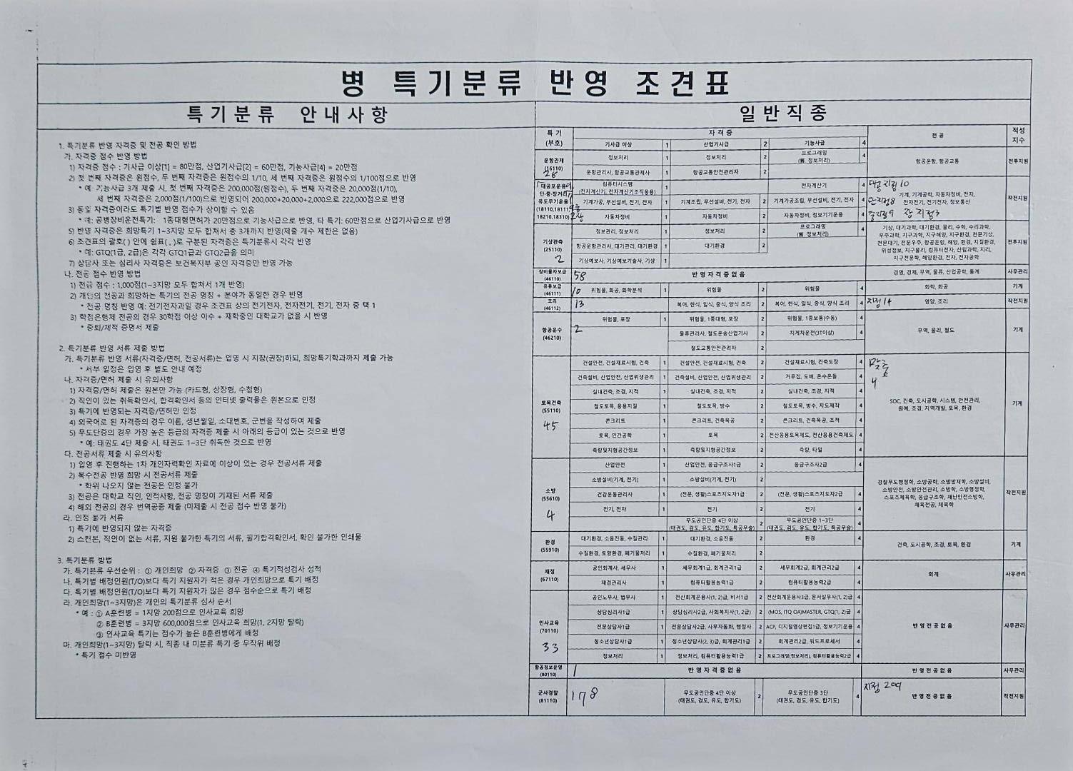 자격증 반영표이다. 위를 잘 읽어보면 기능사급 3개를 들고가면 22만2000점이지만, 산업기사급 1개를 들고 가면 60만점이다. 그래서 다들 산업기사를 따고 가는 것이다. (나도 2학년 맞춰서 정보처리산업기사 들고 갈껄... 정보처리기능사는 그냥 2명중 1명이 가지고 있을 정도로 흔하다.)